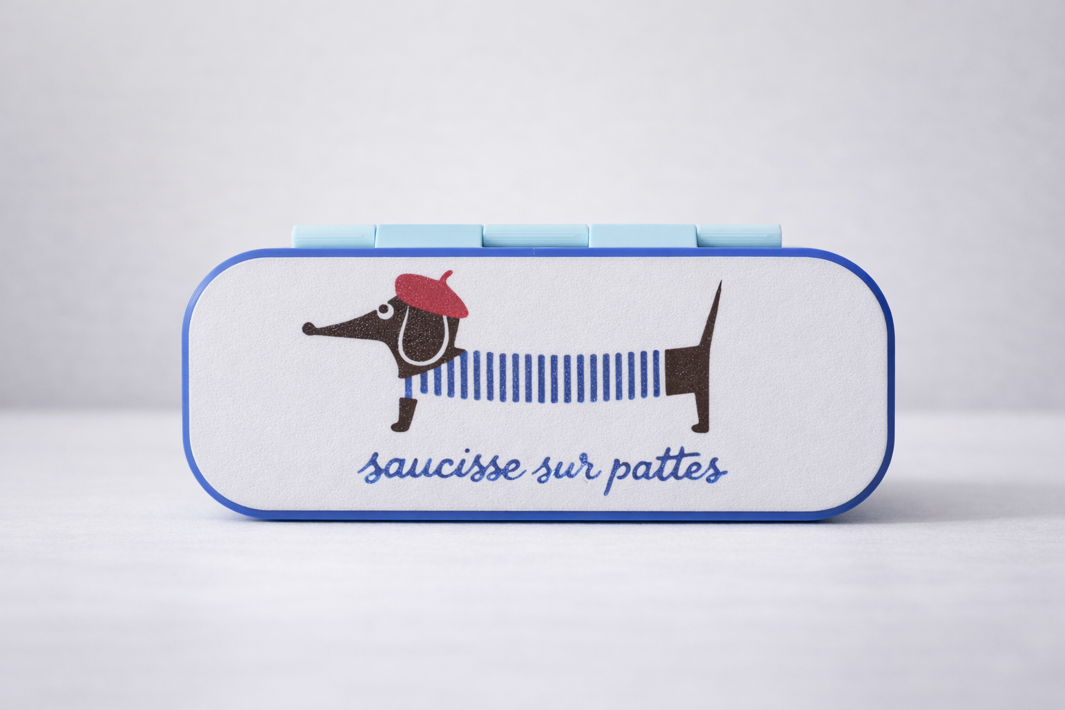 Divertido e cheio de personalidade, este porta-óculos traz a ilustração de um simpático dachshund (o famoso “cachorro salsicha”) com boina vermelha e blusa listrada, em um estilo leve e descontraído.